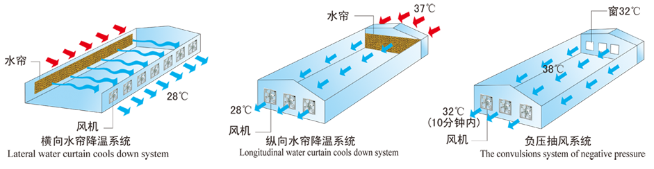 在現代畜牧業通風技術中,濕簾和風機搭配的縱向通風降溫組合是經濟有效的降溫通風措施,濕簾的波紋纖維紙表面有一層水膜,室外干熱空氣通過負壓風機的抽吸作用穿過濕簾,水膜吸收空氣中的熱量,經處理過的涼爽空氣進入室內,同時將室內的污濁空氣排出去。